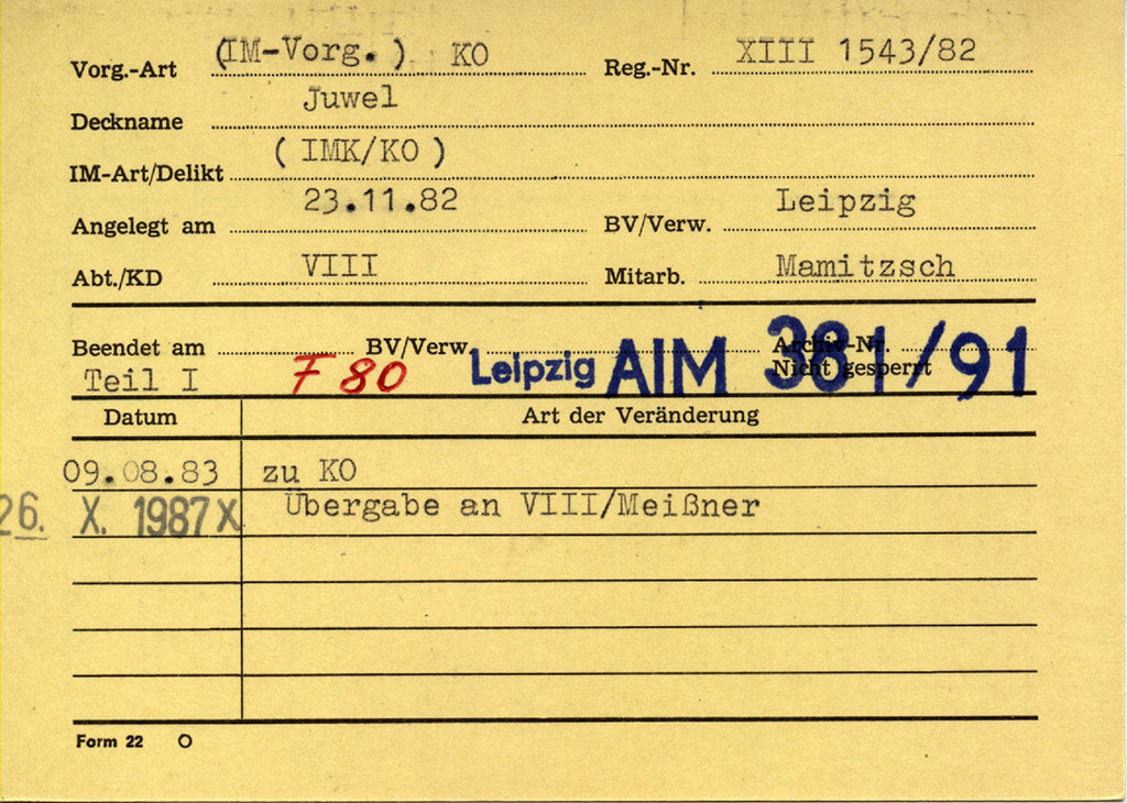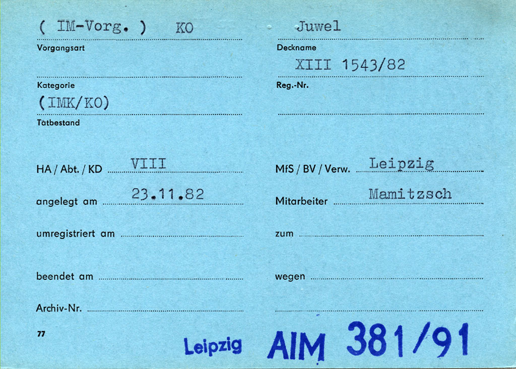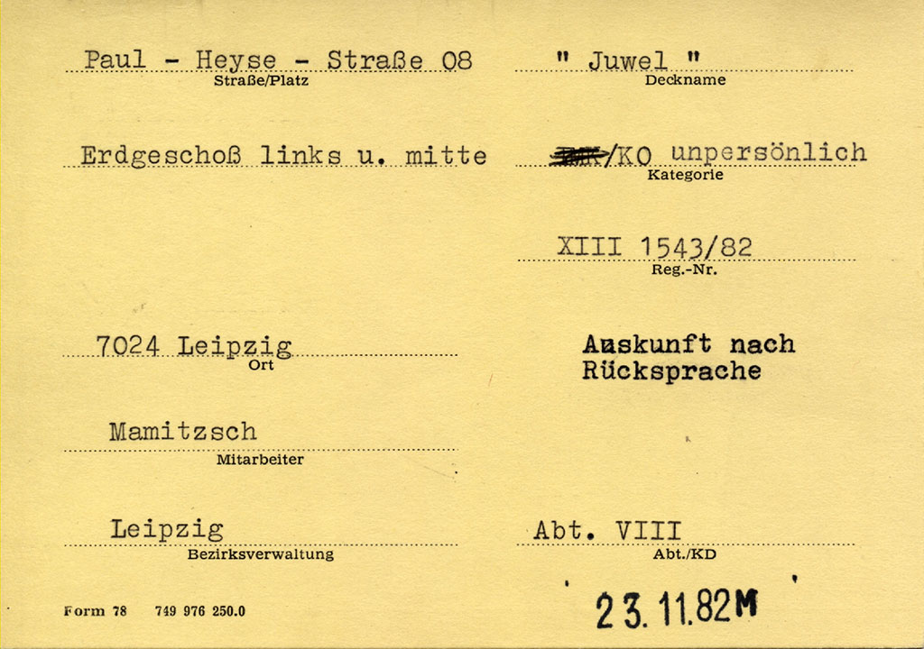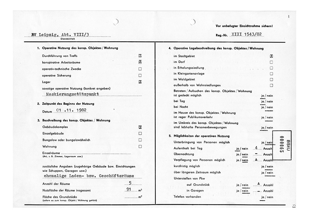 Dann begann die Einsicht in die überlieferten Akten des MfS im Stasi-Unterlagen-Archiv. Die Staatssicherheit hatte zu jeder Konspirative Wohnung (KW) bzw. jedem Konspirativem Objekt (KO) eine IM-Akte mit Decknamen und Registriernummer angelegt. Diese Akten sind wie alle anderen IM-Akten auch über die allgemeine Personenkartei F 16 sowie die Vorgangskartei F 22 zugänglich. Zusätzlich gibt es die Decknamenkartei F 77, die sogenannte Operative Straßenkartei F 78 und die IM-Vorauswahlkartei. Für die konspirativen Objekte existiert zusätzlich die Kartei Objekte und Liegenschaften F 80. Die Mitarbeiter im Stasi-Unterlagen-Archiv haben in einem ersten Schritt die nach Anschriften sortierte Straßenkartei F 78 bezüglich aller Adressen im Stadtgebiet von Leipzig durchgesehen und alle Hinweise auf konspirative Wohnungen und Objekte herausgesucht. Auf dieser Basis wurden dann über weitere Zwischenkarteien die jeweiligen Akten herausgesucht und dem Projektbearbeiter vorgelegt. In den Fällen, in denen keine Akten vorlagen, musste auf die vorgenannten Karteikarten sowie weitere Unterlagen, so bspw. die Verfilmten Auskunftsberichte F 217 zurückgegriffen werden.