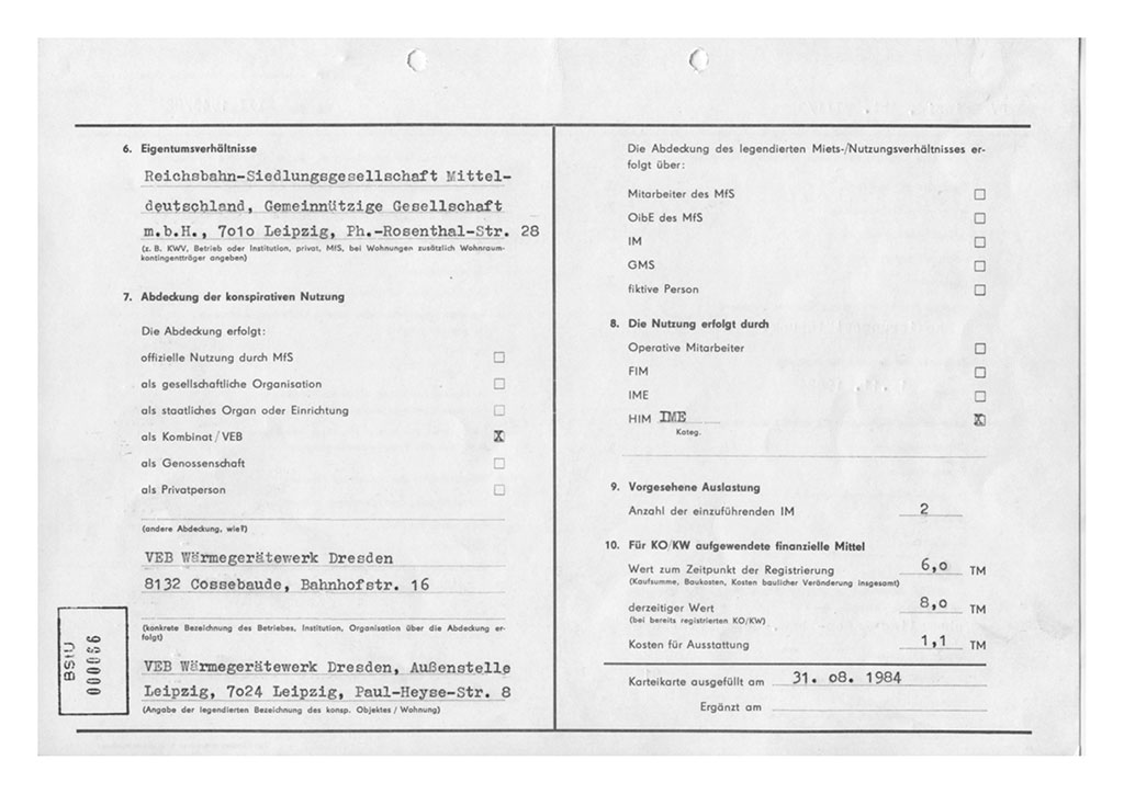 Nach anderthalb Jahren Bearbeitungszeit zeigt sich mit Stand 3. Dezember 2019, dass allein in der Stadt Leipzig zum Zeitpunkt der Auflösung des MfS im Dezember 1989 insgesamt 1.062 aktive Konspirative Wohnungen (KW) und Objekte (KO) anhand überlieferter Akten des MfS nachgewiesen sind. Davon handelte es sich bei 698 um private Wohnungen von Leipziger Bürgern, in denen diese als IMK/KW in der Regel ein Zimmer an die Stasi „untervermietet“ hatten.